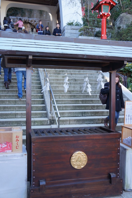 La cola del templo llevaba a este saco (de nuevo con el logo del clan Hojo/Trifuerza) donde la gente hacía sus plegarias.